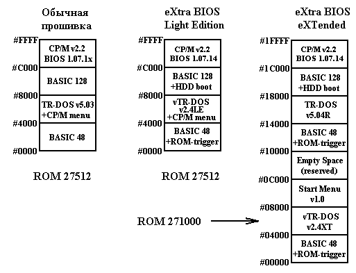 BASIC 48 + ROM-trigger (0x10000 - 0x13FFF) – тот же стандартный бейсик, что и в обычной прошивке. С одной лишь разницей: в нем присутствует т.н. ROM-trigger, переключатель между двумя половинками ПЗУ 271000.