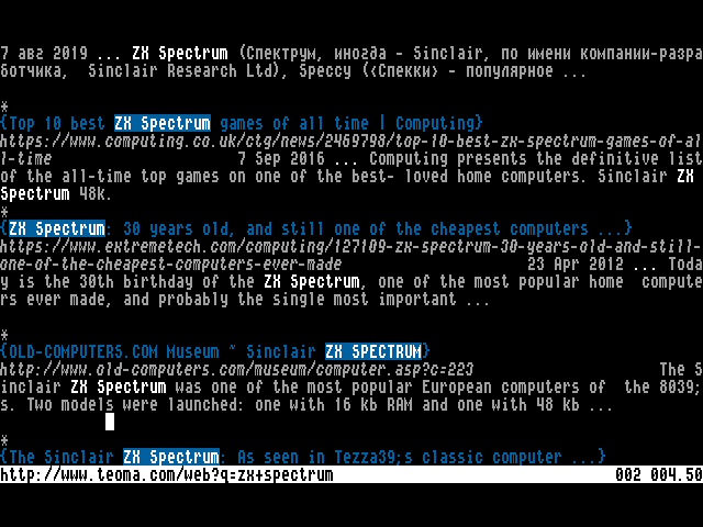 NedoOS – многозадачная операционная система для “русского ZX Spectrum” со средами программирования на ассемблере, Basic, Pascal, C, NedoLang. Работает на TR-DOS, FAT16 и FAT32 с длинными именами, поддерживает tar, gz, zip, rar2 и практически все реально используемые форматы спектрумовских файлов, сетевые утилиты включают Web-браузер и Web-сервер, Telnet-клиент и Telnet-сервер, IRC-клиент и др. Под ОС пишутся игры, в том числе сетевые. Сейчас в репозитории 6 участников. Исходный код всей системы (58 программ) составляет 230 тысяч строк на ассемблере и 70 тысяч строк на Си.
