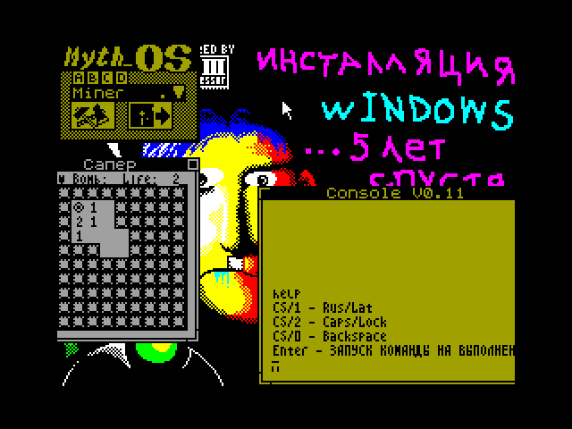 Файлы: можно одновременно открыть до 16 файлов FAT, 8 файлов TR-DOS и 8 очередей. Можно одновременно читать и писать несколько файлов (важно для компилятора) – даже на дискете! Можно считывать параметры файла, указатель на текущую позицию, менять эту позицию, создавать и переименовывать директории. Очереди предполагают две задачи-пользователя, их требуется открывать один раз (при создании), но закрывать дважды. Файловые операции выполняются в контексте ядра, в это время не работает планировщик задач, но работает системный обработчик музыки.