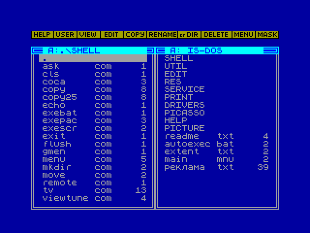Если не считать нескольких версий CP/M (которая изначально писалась не для Спектрума и не использует по достоинству его возможности), первой серьёзной спектрумовской ОС была однозадачная iS-DOS (раз, два, три, архив), разработанная в Санкт-Петербурге в самом начале 90-х. Она «из коробки» предоставляла командер и файловую систему с подкаталогами (ни с чем не совместимую), редактор текстов произвольного размера, много дисков утилит и возможность расширения своими резидентами. К сожалению – расширения только в пределах окна ОЗУ размером 48K. Первые версии iS-DOS довольствовались 41K под всю систему, резиденты и программу пользователя, остальное пространство ОЗУ занимал экран размером 6912 байт.
