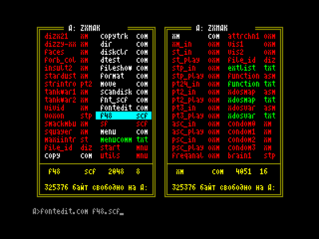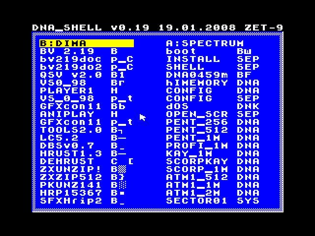 Работа с архивами: .tar и .rar доступны на чтение и запись (ZXRar – урезанный аналог Rar 2.x под DOS - без ряда кодов, solid архивов, мультимедийного формата и шифрования, ZXUnRar поддерживает все коды и solid архивы, но тоже не поддерживает мультимедию и шифрование), .gz и .zip только на чтение. Пока всё только через утилиты командной строки.