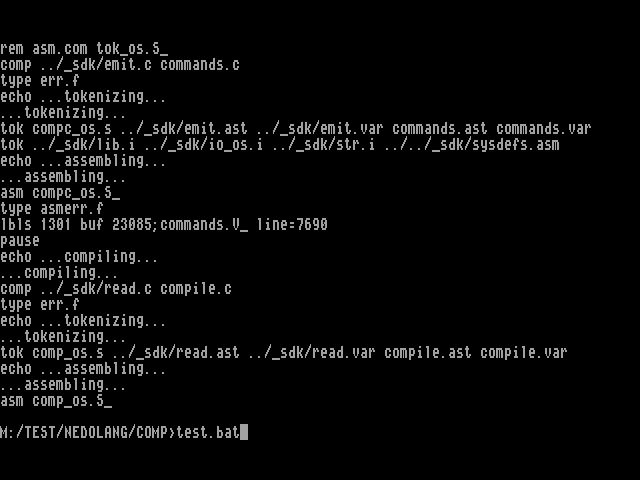 Исходные тексты NedoOS всё ещё не адаптированы под имеющиеся в системе компиляторы (NedoLang и его ассемблер NedoAsm, Turbo Pascal и BDS C). Пока только 5 утилит компилируются внутренними инструментами. А основная часть пакета собирается на PC с помощью SjASMPlus (основной код) и Z80 IAR C (файловая система FatFs и некоторые утилиты).